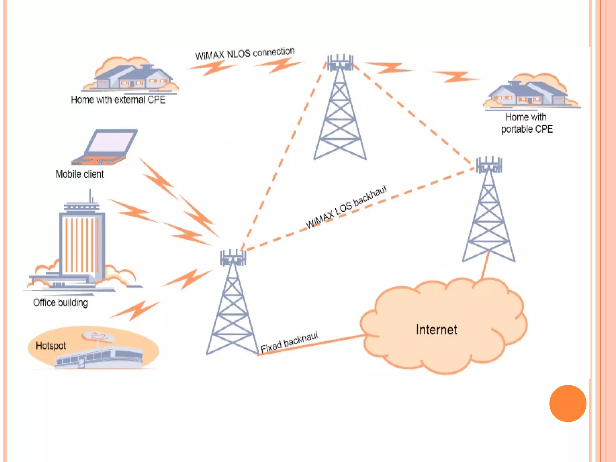 WiMAX is a 4G wireless technology that provides broadband wireless access up to 30 miles for fixed stations and 3-10 miles for mobile stations. It is based on the IEEE 802.16 standard and ensures compatibility between broadband wireless equipment. The WiMAX Forum promotes adoption of WiMAX products and certification of interoperability. WiMAX aims to provide high-speed internet access of 30-40 Mbps download speeds up to 1 Gbps for fixed stations. It uses towers and outdoor receivers to deliver coverage over wide metropolitan areas.