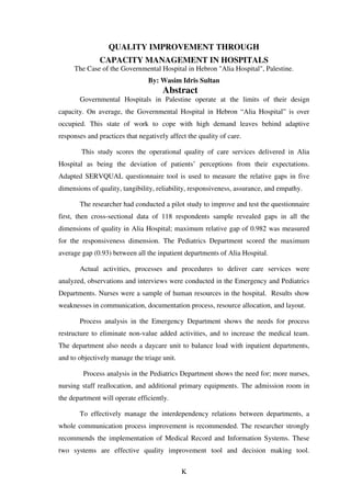 Governmental hospitals in Palestine operate beyond their intended capacity, negatively impacting quality of care. A study of Alia Hospital in Hebron found gaps in all quality dimensions according to patients' perceptions versus expectations. The responsiveness dimension had the largest gap of 0.982. The pediatrics department scored highest for quality gaps among inpatient departments. Analyses of processes in the emergency and pediatrics departments revealed weaknesses in communication, documentation, resource allocation, and layout. Recommendations include restructuring emergency department processes to reduce non-value-added activities, increasing medical staffing, adding a daycare unit, and improving triage. The pediatrics department needs more nurses, staff reallocation, and equipment. Hospital-