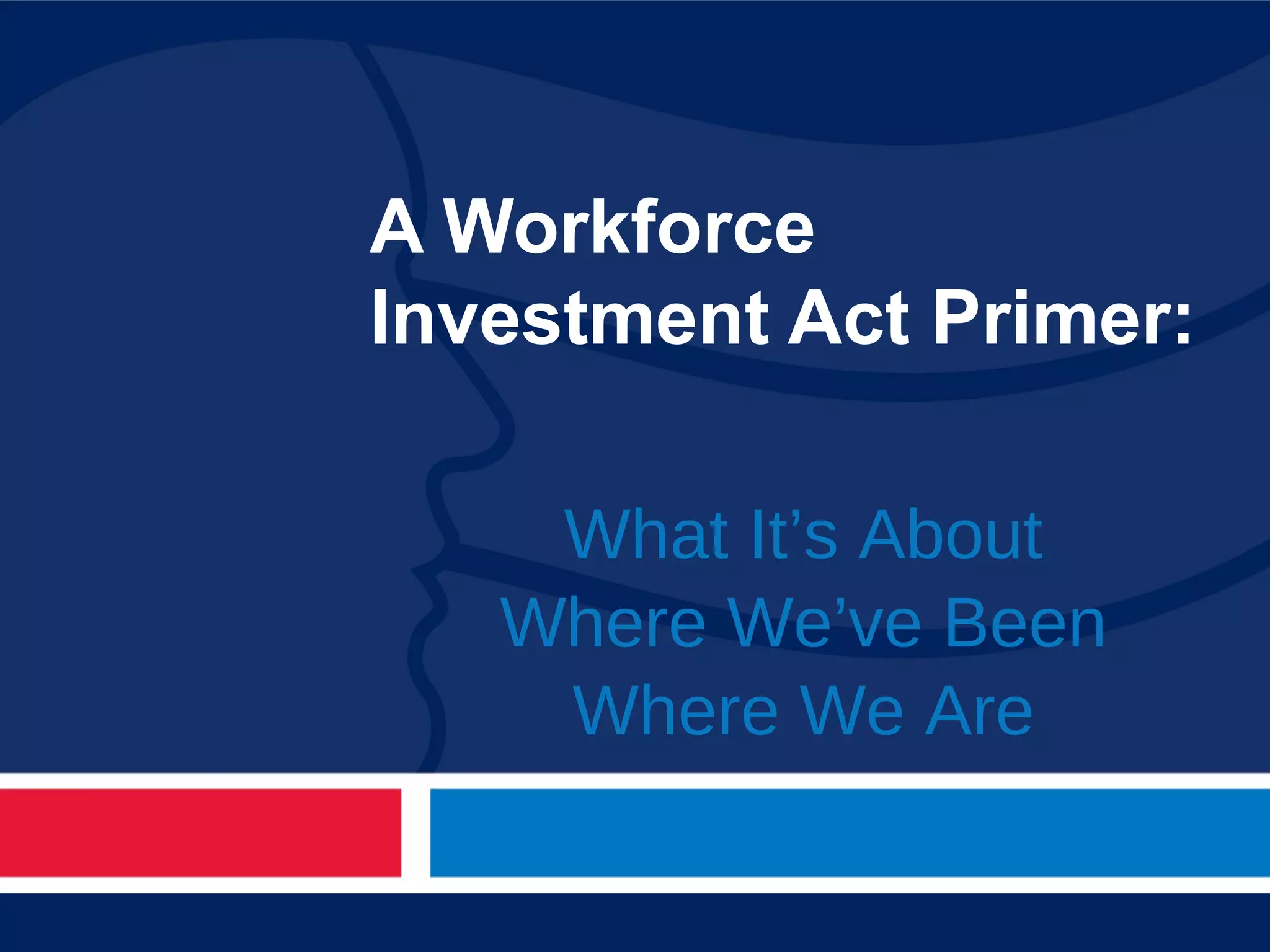 The document presents an overview of the Workforce Investment Act (WIA), detailing its history, purpose, and operational structure. It outlines the roles of workforce boards, local service providers, and the one-stop service system designed to enhance workforce development and improve employment outcomes for various target groups. Key challenges include the focus on serving different populations, funding structure, and the need for effective collaboration within the system.