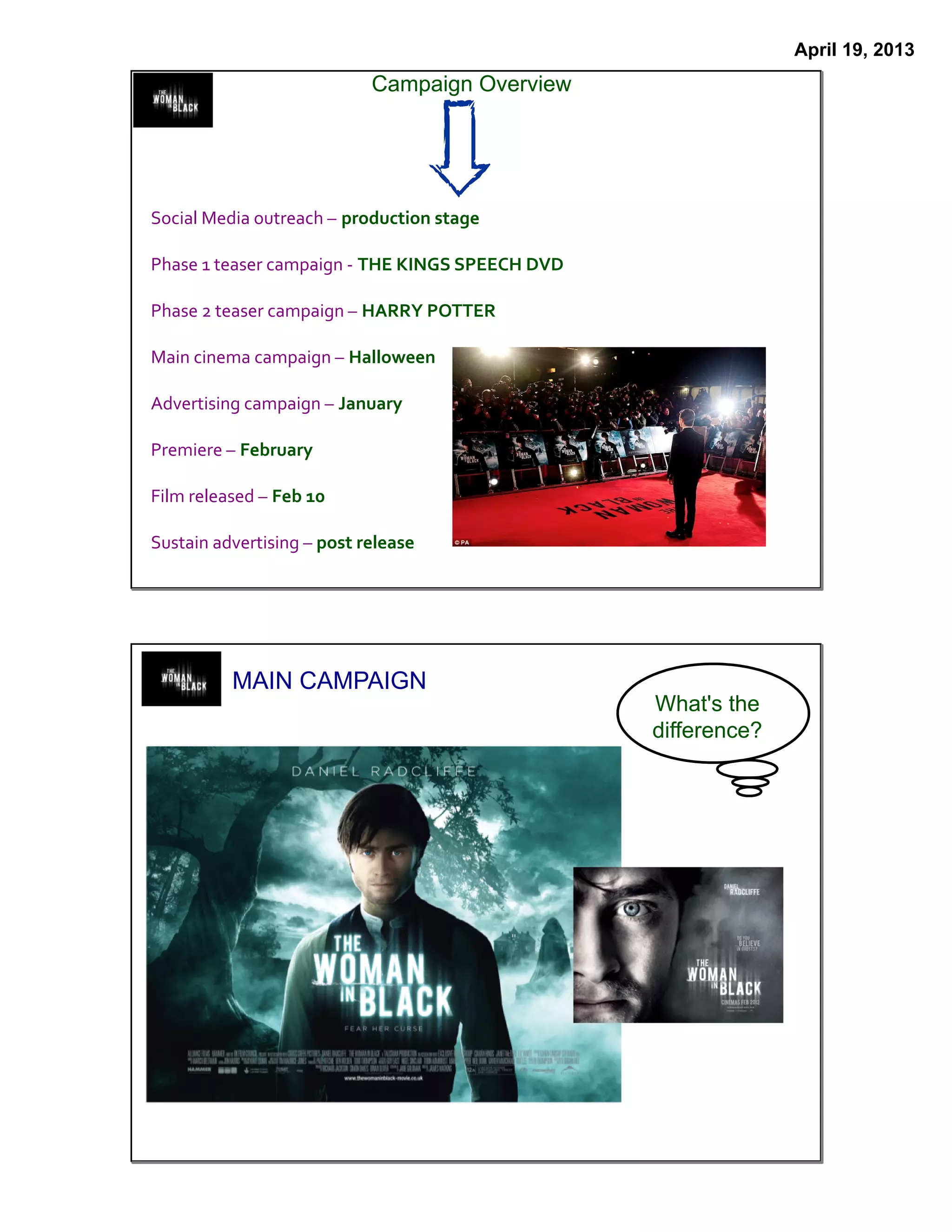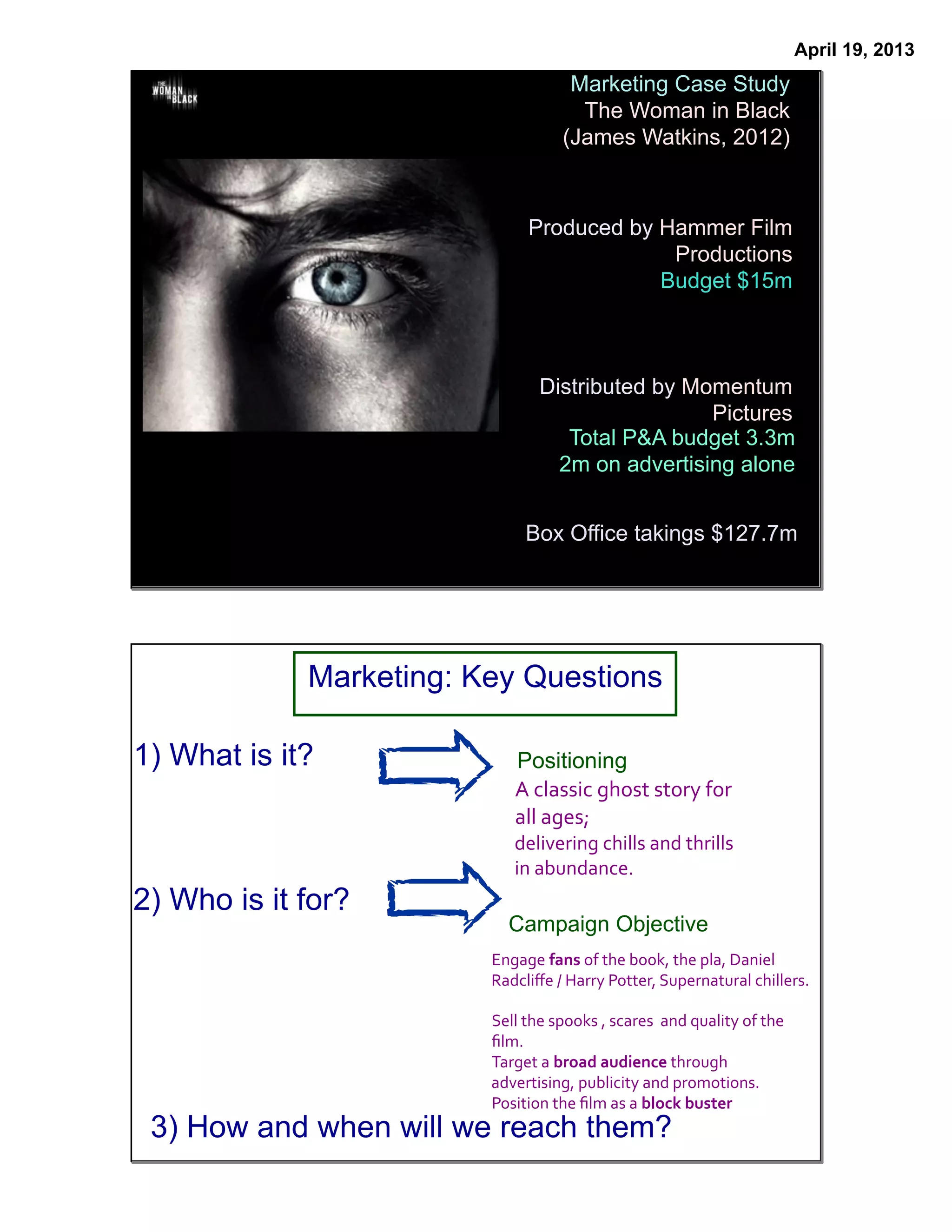 The document outlines the marketing campaign for the 2012 film The Woman in Black. It discusses the film's $15 million budget and $3.3 million marketing budget. The campaign aimed to engage fans of the original book and play, Daniel Radcliffe, and supernatural thrillers. Key elements included a Halloween teaser campaign, a January advertising push, and a February premiere. Publicity efforts centered around Radcliffe's involvement, promoting the heritage of the source material, and a London world premiere. The extensive publicity campaign helped The Woman in Black become the highest-grossing British horror film in 20 years.