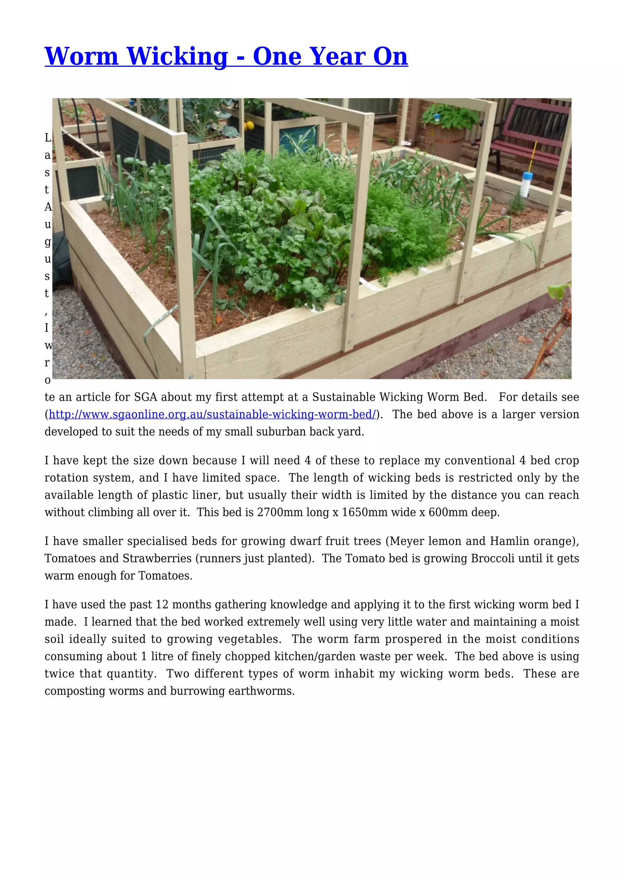 This document provides an overview of the author's experience with and progress on their sustainable wicking worm beds over the past year. Some key points:
