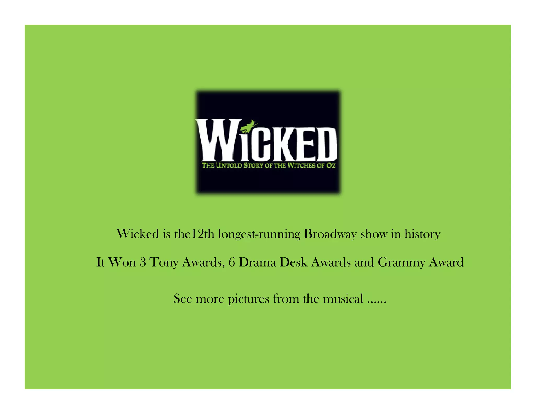Wicked is the 12th longest-running Broadway show, having won 3 Tony Awards and 6 Drama Desk Awards. It tells the story of an unlikely friendship between Glinda the Good Witch of the North and Elphaba the Wicked Witch of the West as they struggle through school with a shared love interest and conflicting personalities, all set against the backdrop of the land of Oz.