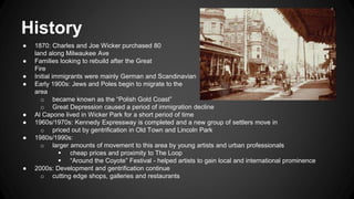 Wicker Park is a neighborhood in Chicago that was initially settled in the 1870s by German and Scandinavian immigrants. It later became home to Jews and Poles and was known as the "Polish Gold Coast" in the early 1900s. Since the 1980s, the area has gentrified and attracted young professionals and artists due to its proximity to downtown and cheap housing prices. Today, Wicker Park is a vibrant neighborhood with many restaurants, shops and a thriving music scene dominated by its young residents. It contains the historic Wicker Park, known for its gardens and fountain, as well as Victorian homes and the Art Deco Northwest Tower building.