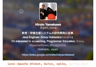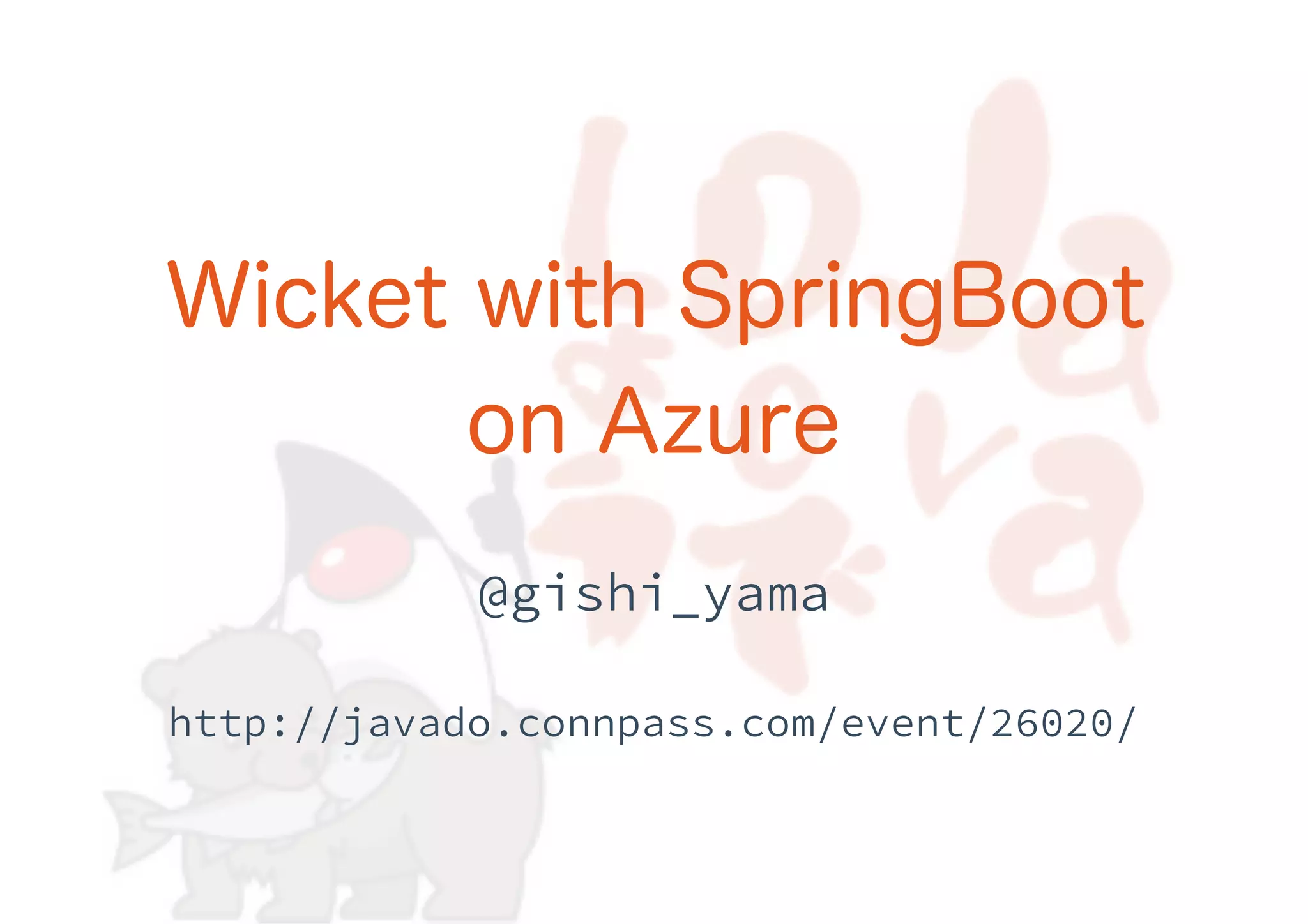 今日のお話 学修シナリオ(案)にむけた 教材のプロトタイプをつくってみた ・せっかくの機会なのでAzureで ※DreamSpark使えると学生がやりやすいはず ・WicketをSpringBootで動かしてみる ・SpringBootをAzure Web Appsで動かしてみる ・Azure