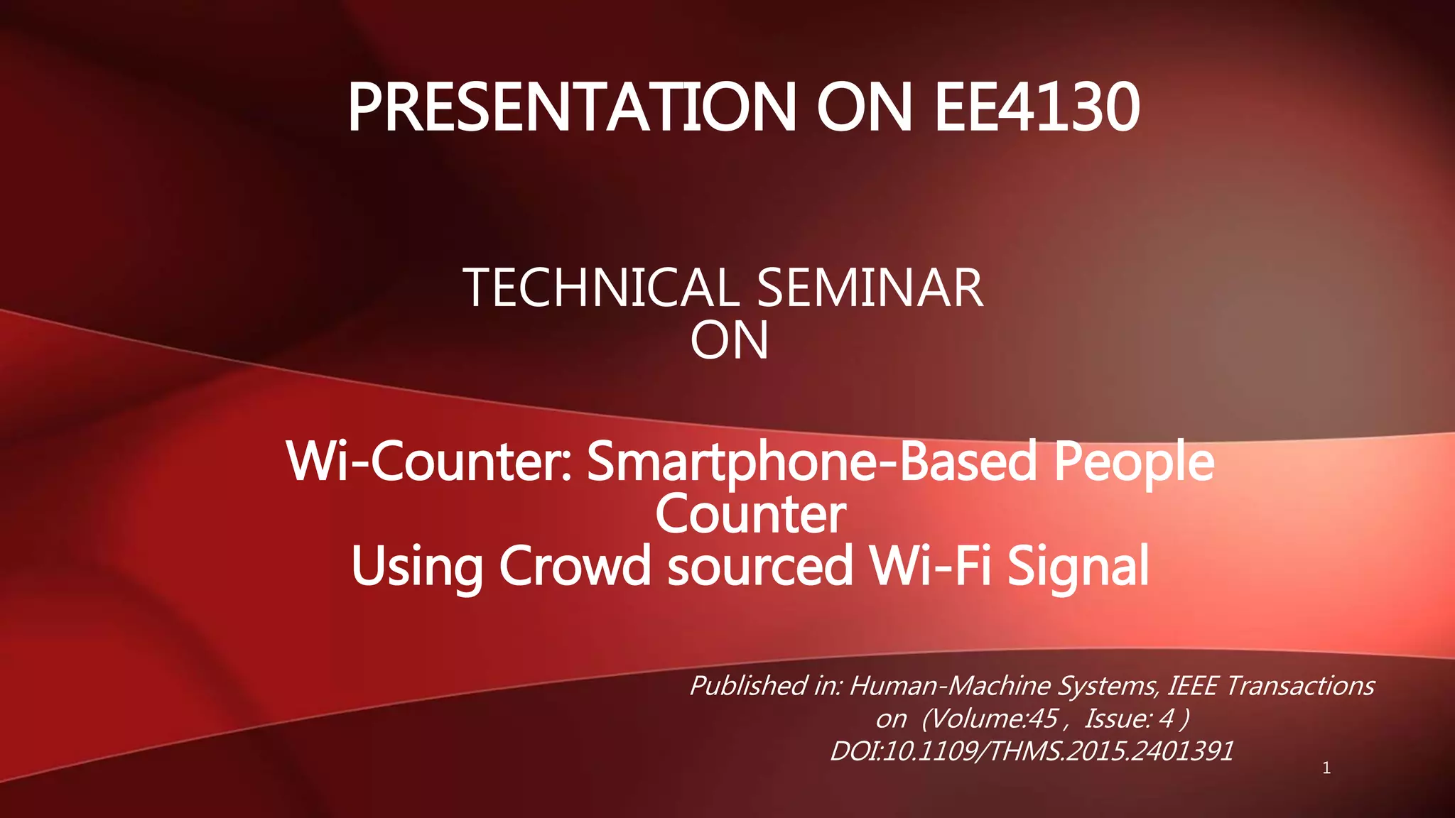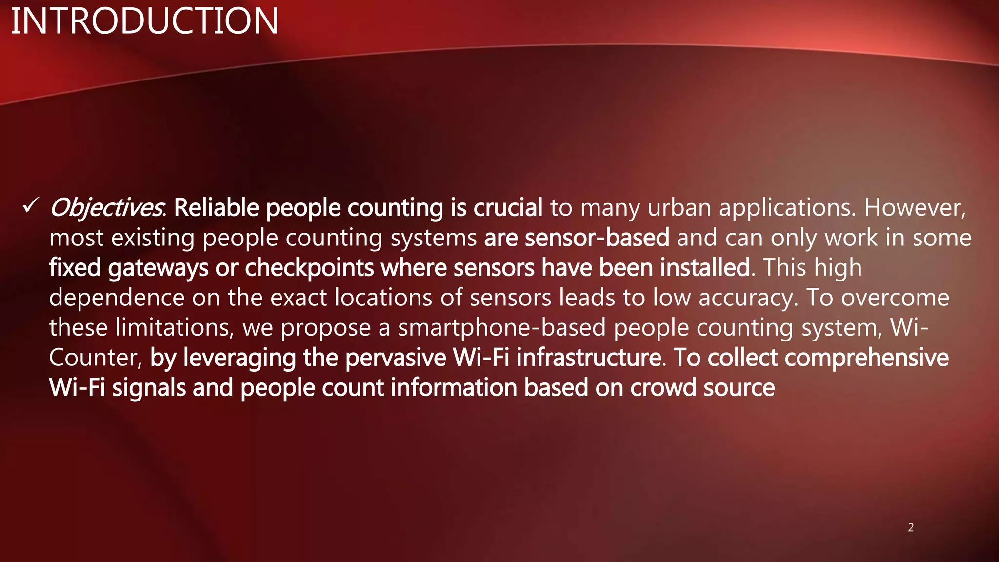 This document presents Wi-Counter, a smartphone-based people counting system that leverages ubiquitous Wi-Fi infrastructure. It consists of three phases: a crowdsourcing phase where a mobile app collects Wi-Fi signals and people counts; an offline training phase where the data is preprocessed and used to train a neural network model; and an online counting phase where the trained model estimates people counts based on new Wi-Fi data. An experiment showed Wi-Counter can reliably count people with up to 93% accuracy by modeling the complex relationship between Wi-Fi signals and number of individuals present. Future work will explore using this approach for people counting over larger areas.