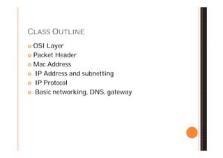 Dokumen tersebut memberikan penjelasan tentang konsep dasar jaringan komputer seperti OSI layer, alamat MAC dan IP, protokol jaringan seperti TCP dan UDP, serta cara konfigurasi dasar jaringan menggunakan Mikrotik RouterOS untuk membangun jaringan lokal sederhana.