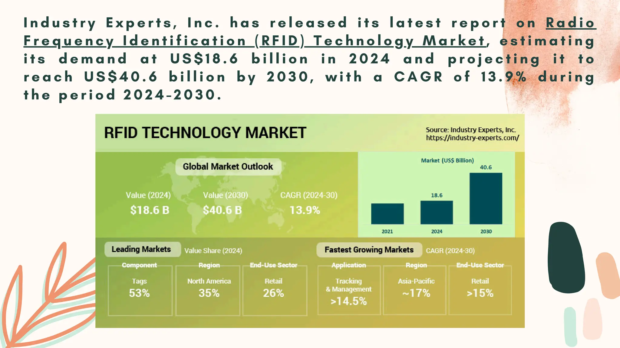 Industry Experts, Inc. has released its latest report on Radio Frequency Identification (RFID) Technology Market, estimating its demand at US$18.6 billion in 2024 and projecting it to reach US$40.6 billion by 2030, with a CAGR of 13.9% during the period 2024-2030.