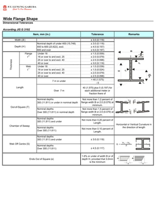 The document provides specifications for wide flange shapes, including: