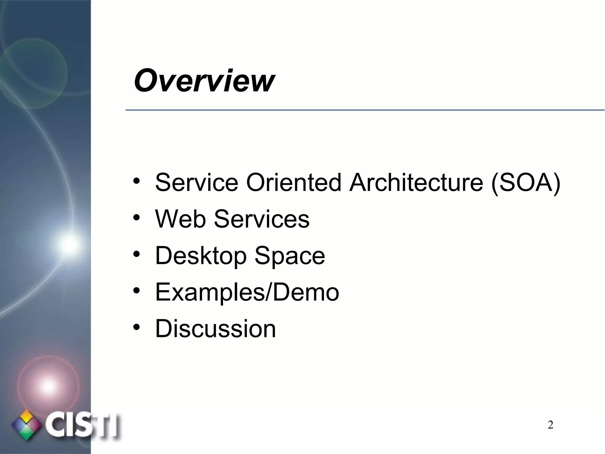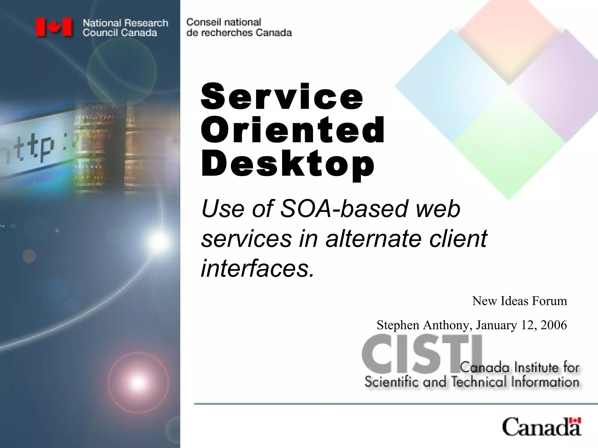 The document discusses the implementation of service-oriented architecture (SOA) for desktop applications, emphasizing the use of web services to improve integration and functionality. It provides an overview of SOA principles, benefits of web services, and potential library services that could be developed, such as document retrieval and alerts. The document also introduces examples of desktop widgets that utilize these web services for enhanced user interaction and service delivery.