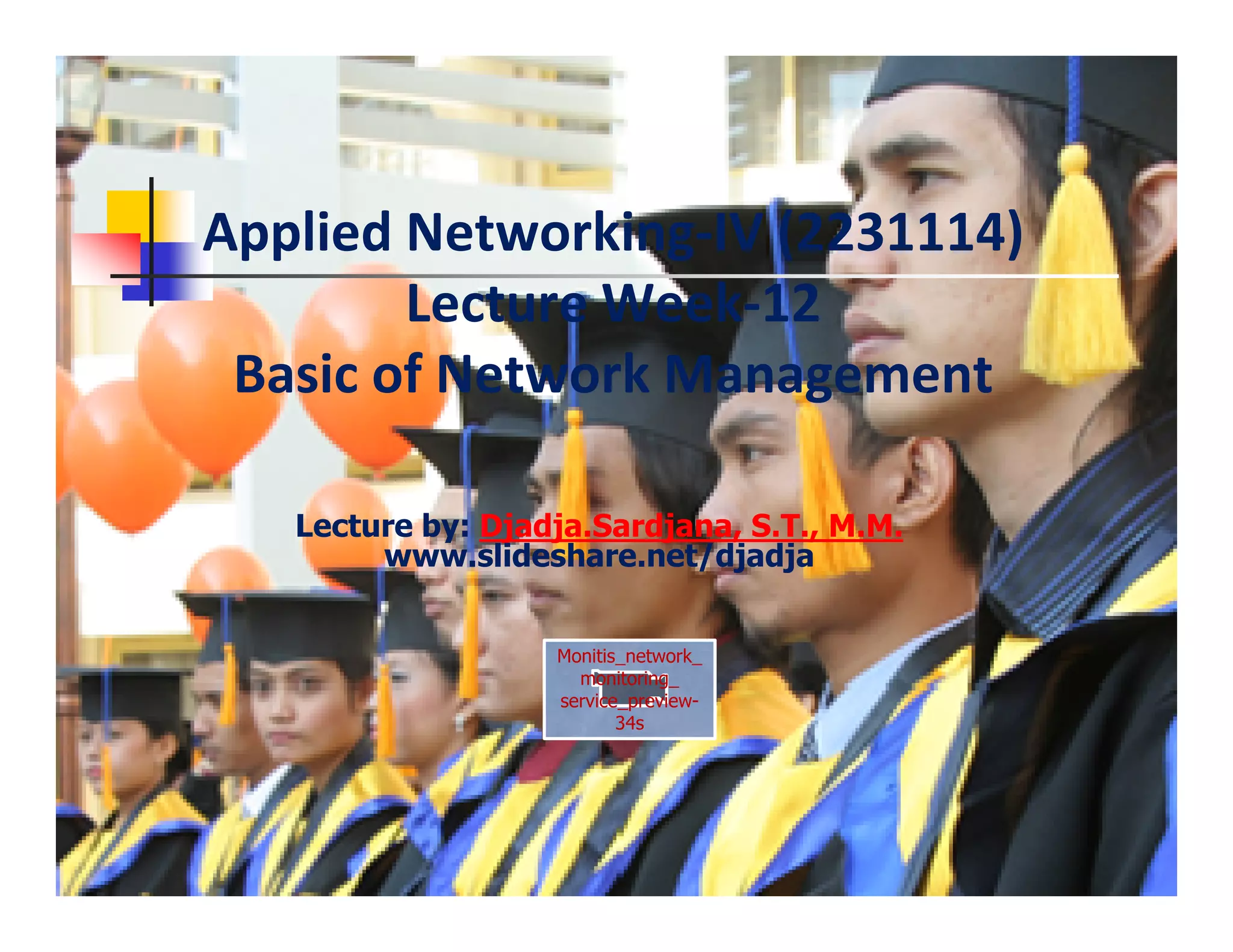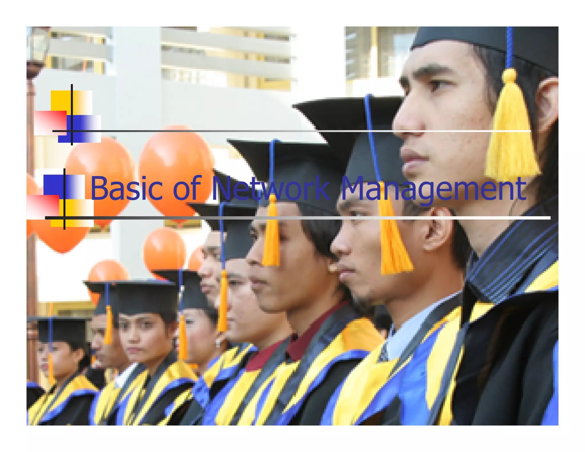 This document discusses the basics of network management. It covers the key components of network management including network devices, management agents, the management information base (MIB), and managed objects. It also discusses the roles of network managers and agents in communicating via management protocols. Finally, it outlines the layers of network management from network elements to business management based on the TMN model.