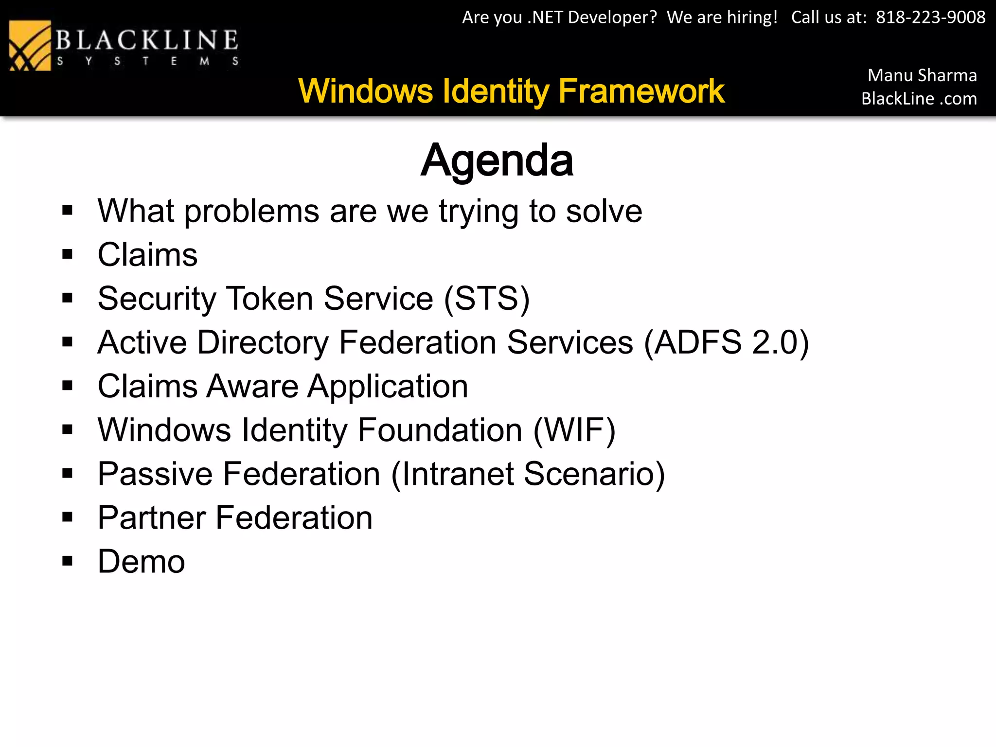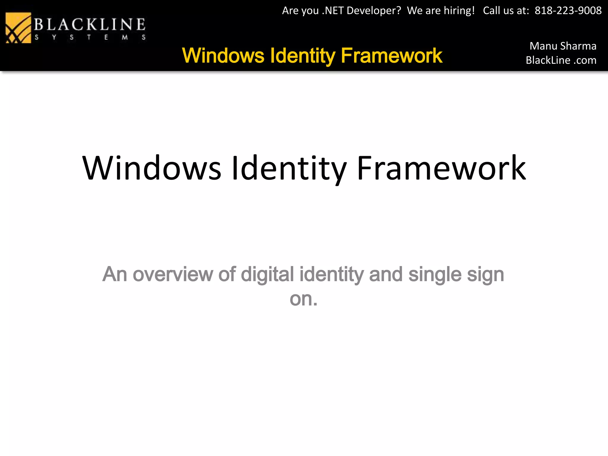 This document provides an overview of digital identity and single sign-on using Windows Identity Framework. It discusses problems with separate user stores per application and outlines how claims, security token services, Active Directory Federation Services, and Windows Identity Foundation can provide a common identity model to solve these problems. It then describes passive and partner federation scenarios and concludes with a demo.