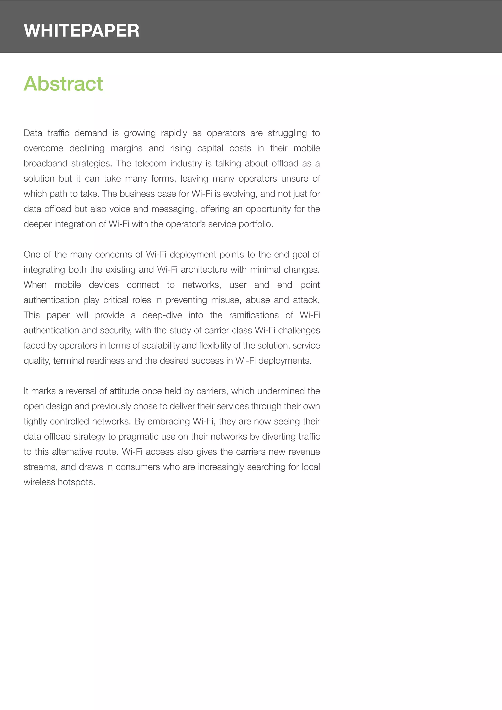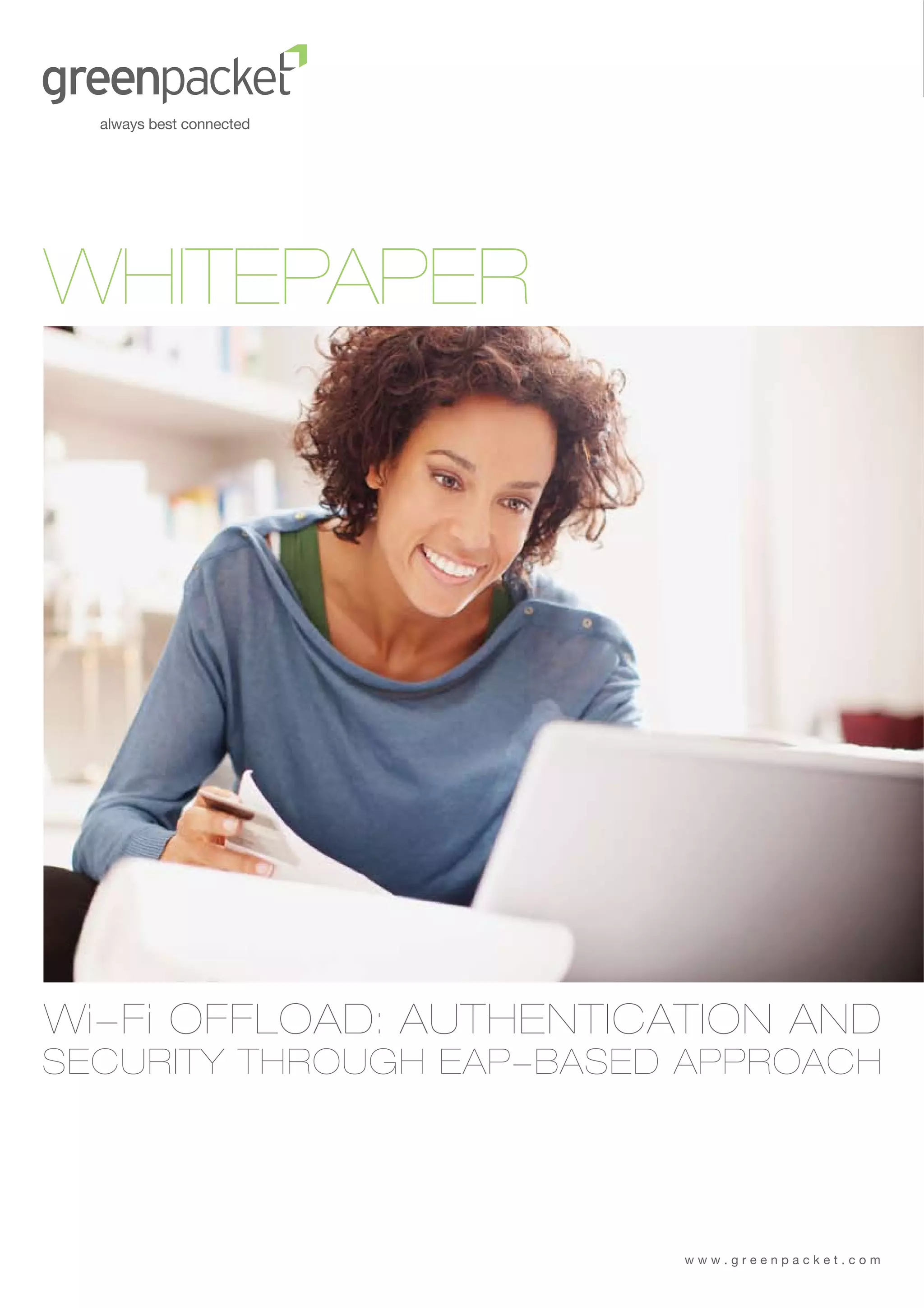This whitepaper discusses Wi-Fi offloading and the challenges of building a carrier-class Wi-Fi experience. It covers authentication, security, and roaming challenges and proposes EAP-based authentication approaches. It also discusses integrating the mobile core for provisioning, policy control, and billing. Finally, it introduces Greenpacket's Wi-Fi offloading solutions of smart data offload, seamless data offload, and dynamic data offload.