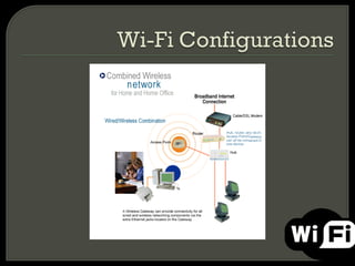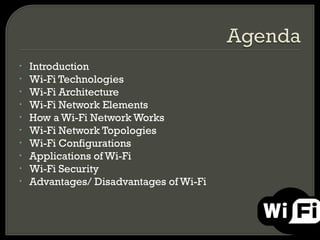 This document provides an overview of Wi-Fi technology, including its standards, components, configurations, security features, and applications. Wi-Fi allows devices to connect to a wireless local area network and the Internet using radio waves. Common Wi-Fi standards are 802.11b, 802.11a, and 802.11g. A Wi-Fi network uses access points that act as base stations for connecting wireless devices within a range of about 100 feet indoors. Wi-Fi provides mobility and flexibility but can be slower than wired connections and more vulnerable to security issues.