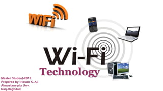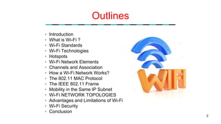 This document provides an overview of Wi-Fi technology. It defines Wi-Fi as a wireless networking standard based on the IEEE 802.11 specifications. It outlines the various 802.11 standards including 802.11b, 802.11a, 802.11g, and 802.11n, and describes their characteristics such as speed and frequency band. It also discusses Wi-Fi network elements, channels and association, mobility, network topologies of infrastructure and ad-hoc modes, and long-range Wi-Fi applications. Security and limitations of Wi-Fi are also mentioned.