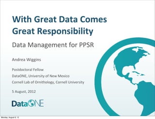 The document discusses the importance of responsible data management for participatory science and research (PPSR) projects. It emphasizes that PPSR data has value and potential to advance science if managed properly. The author's vision is for PPSR data to be treated equally to other scientific data and for all PPSR projects to have data policies, management plans, shared data, and appropriate tools and resources for handling data. The document encourages PPSR researchers to see data management not as separate but integrated into the entire research process.