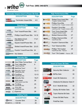 This document provides a catalog of professional quality impact and insert bits made by Wiha. It includes Torx, Phillips, Pozidriv, hex, and other bit styles in both insert and power formats. Bit sets and individual bits are listed along with item numbers and pricing for ordering. The document promotes Wiha bits as providing up to 30 times the impact performance of standard bits due to their durable design and precise machining.