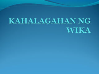 Ang dokumento ay tungkol sa mga pinagkunan, katangian, at kahalagahan ng wika. Ipinakita dito ang iba't ibang teorya ng pinagmulan ng wika at ang mga katangian nito tulad ng pagiging masistemang balangkas, sinasalitang tunog, at nakabatay sa kultura. Tinalakay din ang dinamismo ng wika at ang kanya-kanyang natatanging aspeto nito bilang bahagi ng komunikasyon.