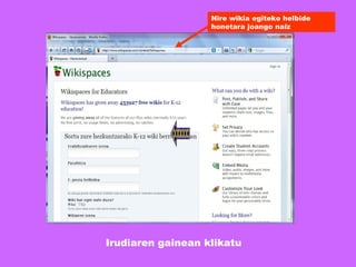 Wiki bat egin 1. 2. 3. Datuak sartu Nire wikiaren helbidea Nire wikia publikoa edo babestua izatea aukeratuko dut Amaitu ondoren botoi hau sakatu Gunea Hezkuntzarako dela ziurtatuko dut 4. 5. Hau da sortu dudan wikia Nire wikiaren itxura aldatzeko, Kudeatu wikia sakatuko 6. 7. 8. 9. “ Arakatu” botoia sakatu behar dut Igo nahi dudan irudia aukeratu bere gainean bi klik egiten Gordetzeko botoi hau sakatuko 10. Gero, idazteko botoi hau sakatu behar dut “ Home” atalean aurkezpena egingo dut “ Home” botoia sakatu behar dut 11. 12. 13. 14. 15. 16. Lehendabizi, nire atal propioak egin nahi baditut, “Include page list” koadrotxoa kentzen dut “Widgeta ezabatu” aukera sakatuz. 17. 18. 19. 20.