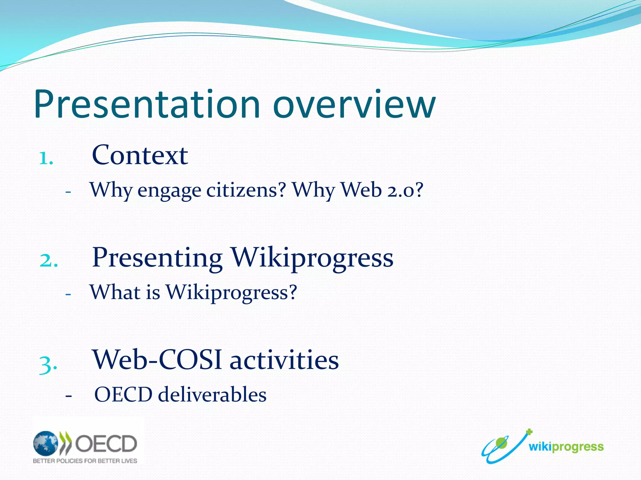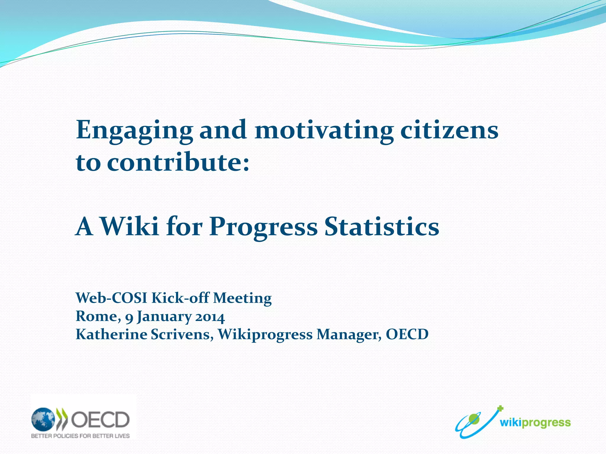 The document discusses the OECD's initiative, Wikiprogress, aimed at engaging citizens in the measurement of progress beyond GDP by utilizing a collaborative web platform. It outlines strategies for involving various stakeholders, improving data accessibility, and integrating official and non-official statistics. Additionally, the document highlights specific work packages and deliverables set for 2014 to enhance citizen participation and the overall effectiveness of the initiative.