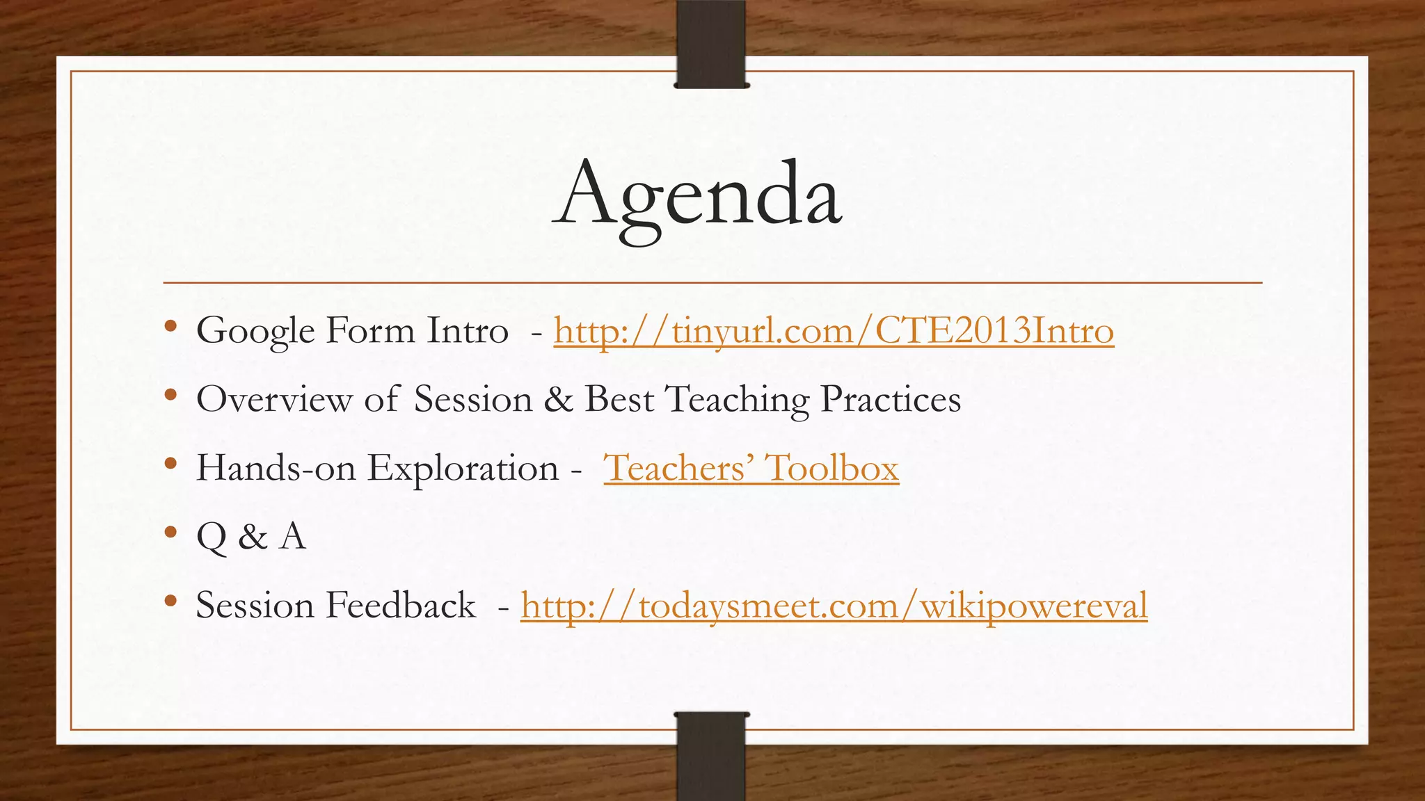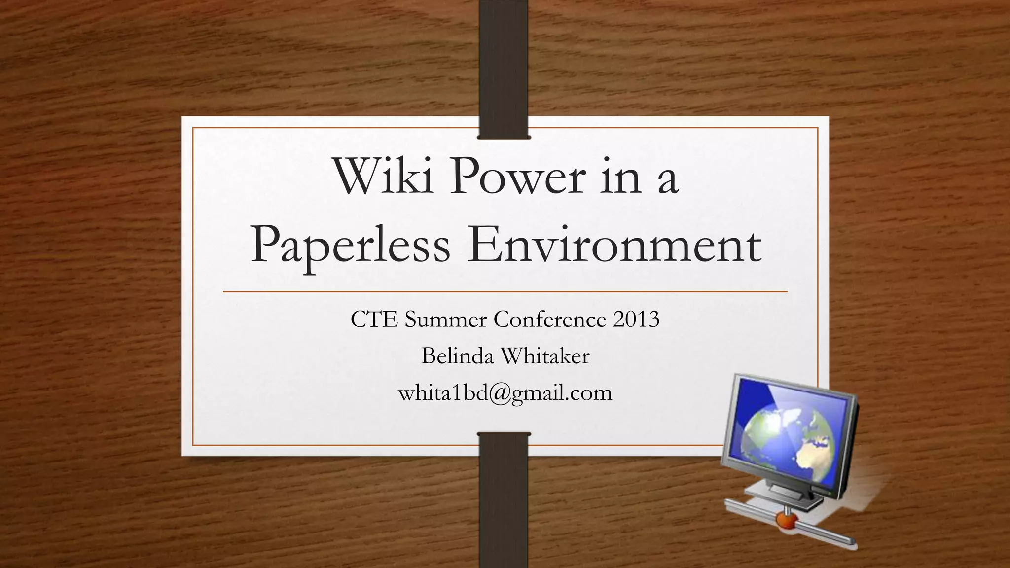This document provides an agenda for a session on using wiki technology in a paperless environment. The agenda includes an introduction to Google Forms for feedback, an overview of best teaching practices using wiki tools, and a hands-on exploration of various online collaboration and organization tools for teachers. Some examples mentioned are Wikispaces, Bubbl.us, LiveBinders, Cacoo, ClassJump, Pizap, Padlet, Chatzy, and Educreations. The session aims to demonstrate how wikis and related tools can help create a paperless classroom environment.