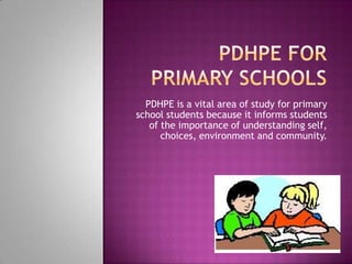 PDHPE teaches primary school students about physical health, personal wellbeing, and safety. It promotes physical activity, nutrition, respect for others, and decision making. Students learn to understand themselves, make choices about their environment and community, and identify hazards to stay safe. Overall, PDHPE provides an essential education for students to develop skills for healthy lifestyle choices.