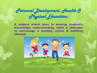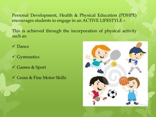Personal Development, Health & Physical Education (PDHPE) aims to develop students' knowledge, understanding, skills and attitudes to encourage a healthy, active and fulfilling lifestyle through physical activity like dance, gymnastics, and sports. It also teaches personal health and safe living choices, personal growth and development, and successful interpersonal relationships. The subject encourages an active lifestyle and positive health choices in a fun way.