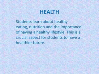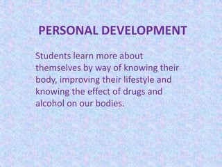 This document discusses the importance of personal development, health, and physical education (PD/H/PE) for primary students. It explains that PD/H/PE helps students learn about themselves, healthy eating and lifestyles, different exercises and sports. The most important thing is that students have fun learning this information, which will help them make better choices for a healthy adult life.