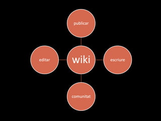 Què és? Elterme “wiki” prové del hawaià i significa ràpid Pàgina web on els usuaris poden crear, editar o modificar el contingut, i fer-ho d’una manera senzilla, interactiva i ràpida. Alhora, un wiki és la base de dades on-line més simple que pot funcionar .