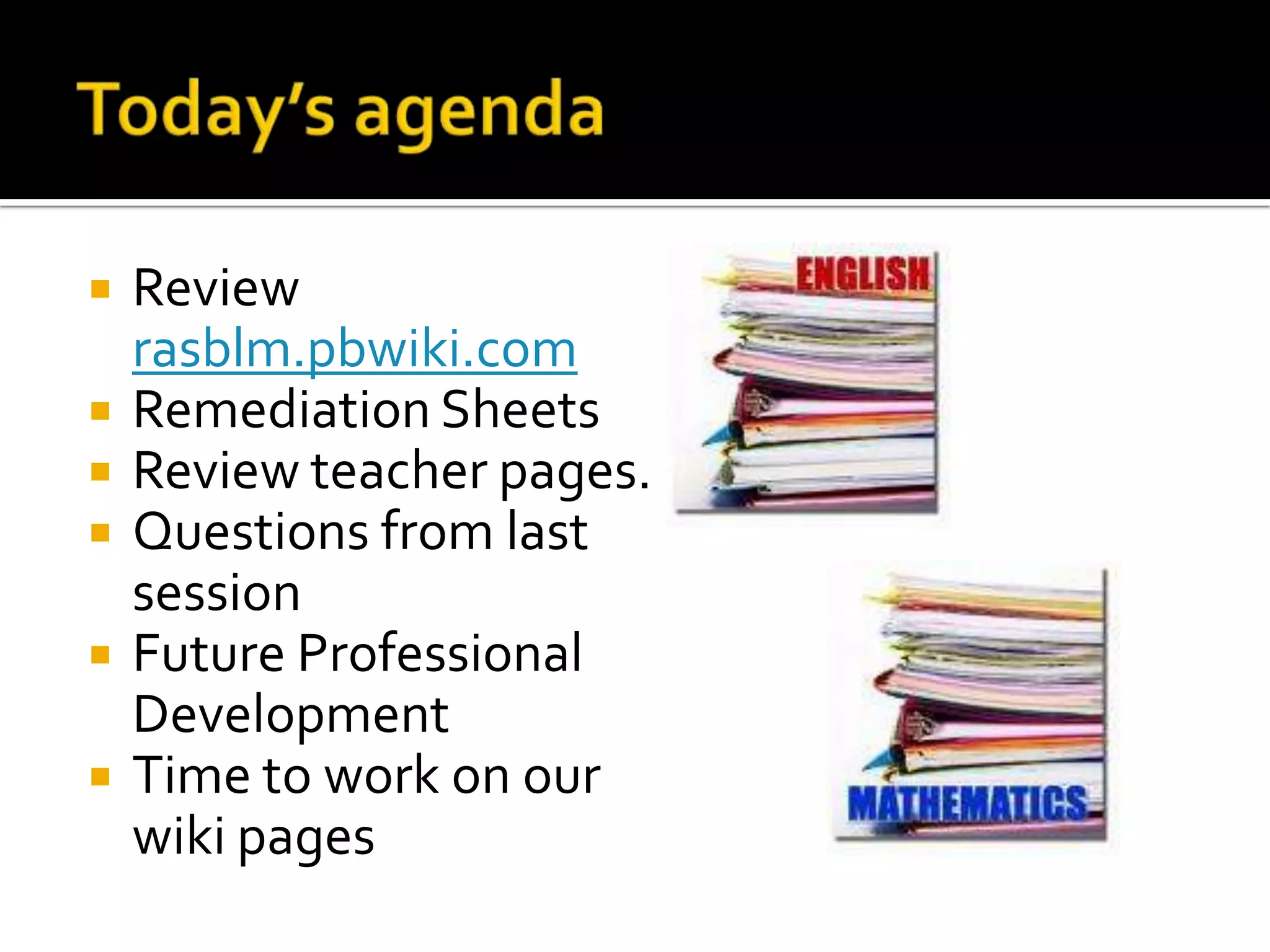 This document summarizes an agenda for a professional development meeting on using wikis. It includes reviewing existing wiki pages, discussing how teachers have used wikis in different subject areas, and working on individual wiki pages. Future professional development topics will focus on additional Web 2.0 tools like Google Docs, social bookmarking, and podcasting. Teachers will have time to work on their wiki pages during the meeting.