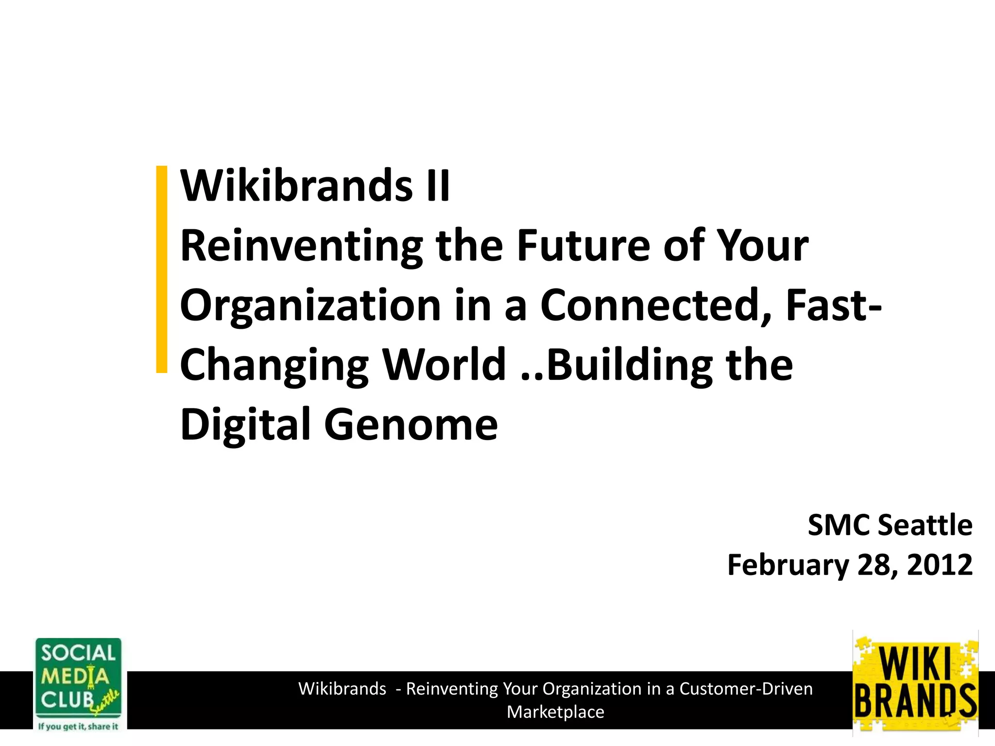 The document discusses a presentation on reinventing organizations for a connected, fast-changing world through building a "digital genome" and discusses Wikibrands as a way for organizations to engage customers through social media. Several trends impacting digital engagement over the next few years are identified, including a focus on experience, entertainment, curation, connection, and innovation. Measurement of social media efforts and balancing strategic objectives with incentives, resources, and culture are also covered.