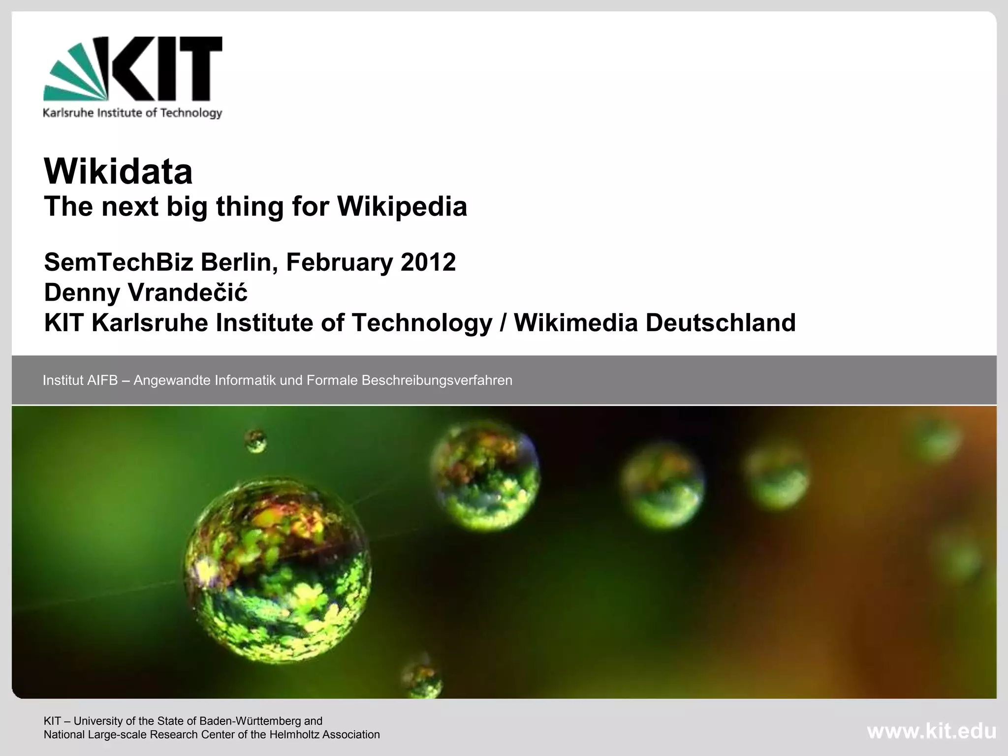 The document summarizes Wikidata, which is presented as the next big thing for Wikipedia. Wikidata aims to provide a database of the world's knowledge that is machine-readable and can be edited by anyone. It seeks to collect references for data items, engage a global community to collect data, increase Wikipedia quality, and enable other data collection projects. The presentation outlines Wikidata's goals and a three-phase project plan to link language editions, augment info boxes, and enable inline queries in Wikipedia.