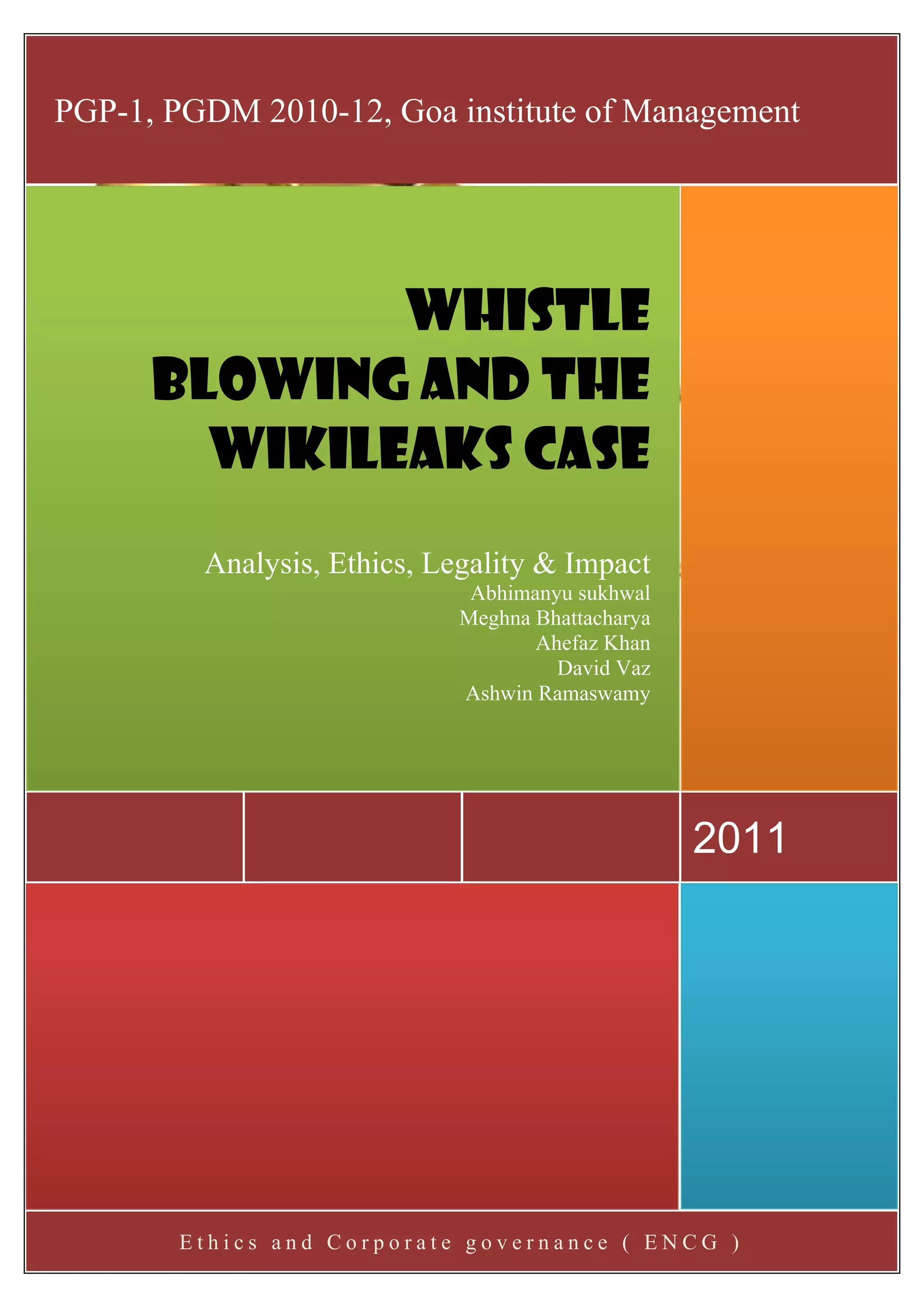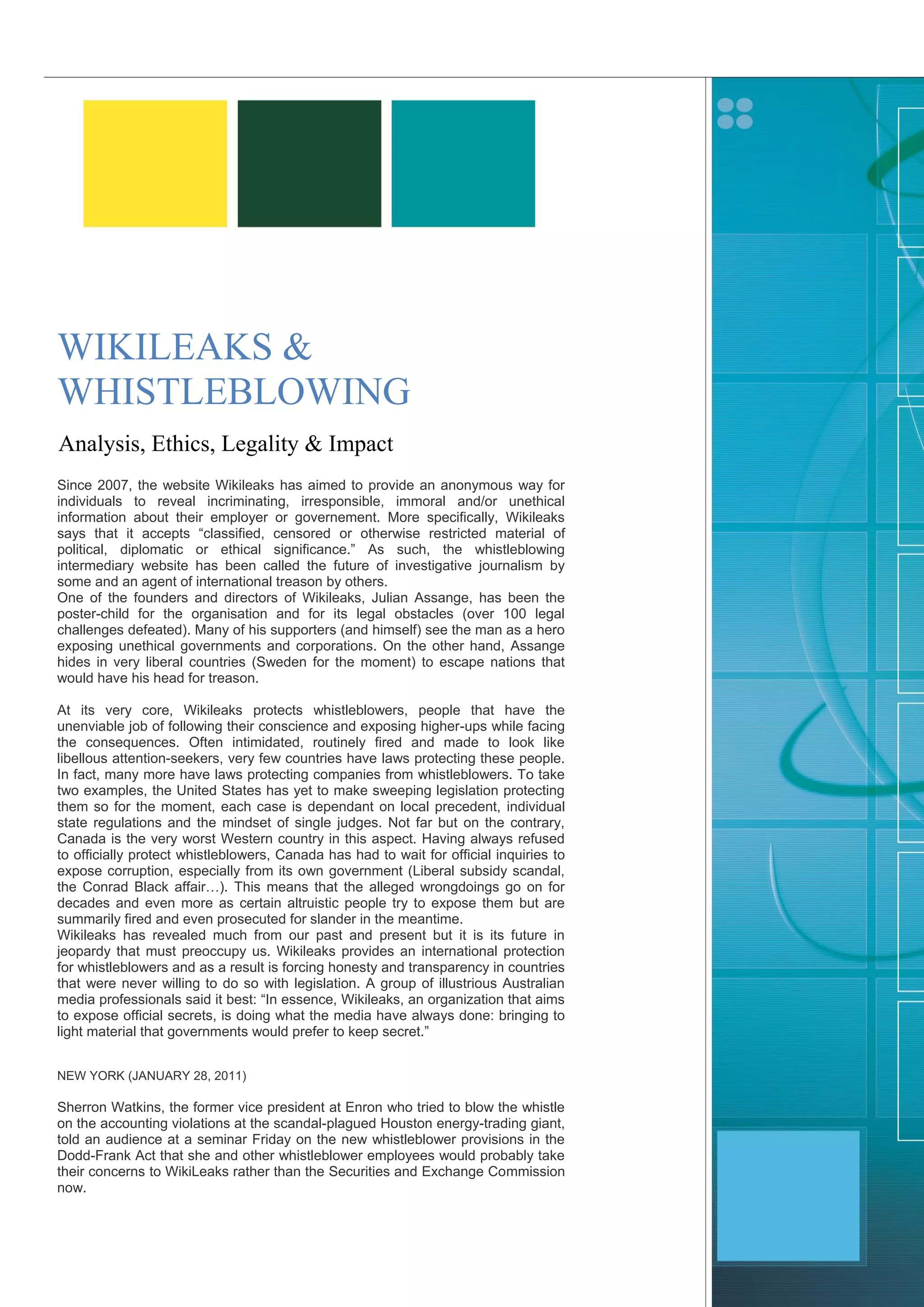 The document discusses WikiLeaks and the ethics of whistleblowing. It provides background on WikiLeaks and its role in protecting whistleblowers. Issues around the legality and ethics of whistleblowing are examined, such as whether whistleblowers should resolve issues internally first or if exposing wrongdoing is justified even without attempting internal resolution.