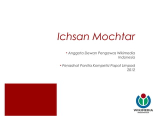 Dokumen ini memberikan gambaran umum tentang organisasi Wikimedia Indonesia dan proyek Wikipedia bahasa Indonesia. Wikipedia bahasa Indonesia memiliki lebih dari 100 ribu artikel dan 1,2 juta pengunjung per hari, serta menduduki peringkat 18 dari 270 proyek berdasarkan jumlah pengunjung. Wikimedia Indonesia adalah organisasi nirlaba yang mendukung penyebaran pengetahuan bebas dan pemberdayaan masyarakat untuk berkontribusi dalam proyek-proy
