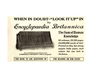 Wikipedia is a free online encyclopedia that is collaboratively written and edited by volunteers. It contains over 4 million articles in English and over 25,000 new articles are added each month. Contributors are self-selected volunteers and the average contributor is a 22 year old male. While Wikipedia aims to be a reliable source of information, students should not directly cite it in research papers and should check sources and information on the site.