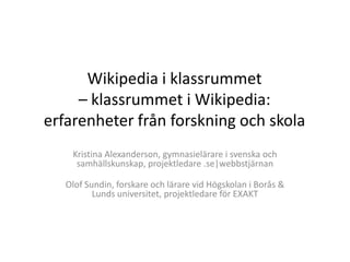 Wikipedia i klassrummet– klassrummet i Wikipedia:erfarenheter från forskning och skola Kristina Alexanderson, gymnasielärare i svenska och samhällskunskap, projektledare .se|webbstjärnanOlof Sundin, forskare och lärare vid Högskolan i Borås & Lunds universitet, projektledare för EXAKT