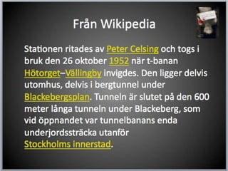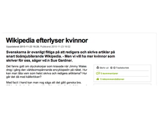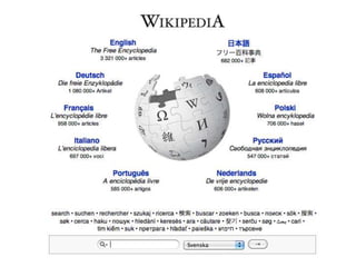 Wikipedia …Är ettonline-uppslagsverk där alla kan bidra med innehåll.Bidragen berör artiklar som sådana, men också massor med s k meta-aktiviteter.Engelskspråkiga Wikipedia har ca 3 630 000 artiklar, men Wikipedia finns i mer än 250 språkversioner.Formas genom en mjukvaruplattform (wiki) och centrala policy-dokument och riktlinjer.Sjunde mest besökta platsen på nätet (Alexa, 2011-05-13).