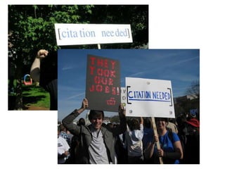 Källhänvisningar som hantverk”Omdet inte är troligt att det finns källor ska det inte finnas en artikel”. ”Det bästa man kan slå folk i huvudet med på Wikipedia det är ju referenser till olika typer av verk och källor.””Wikipedia vore ju omöjlig att skriva utan tillgång till tryckta källor. Den är ju så att säga baserad på det.”