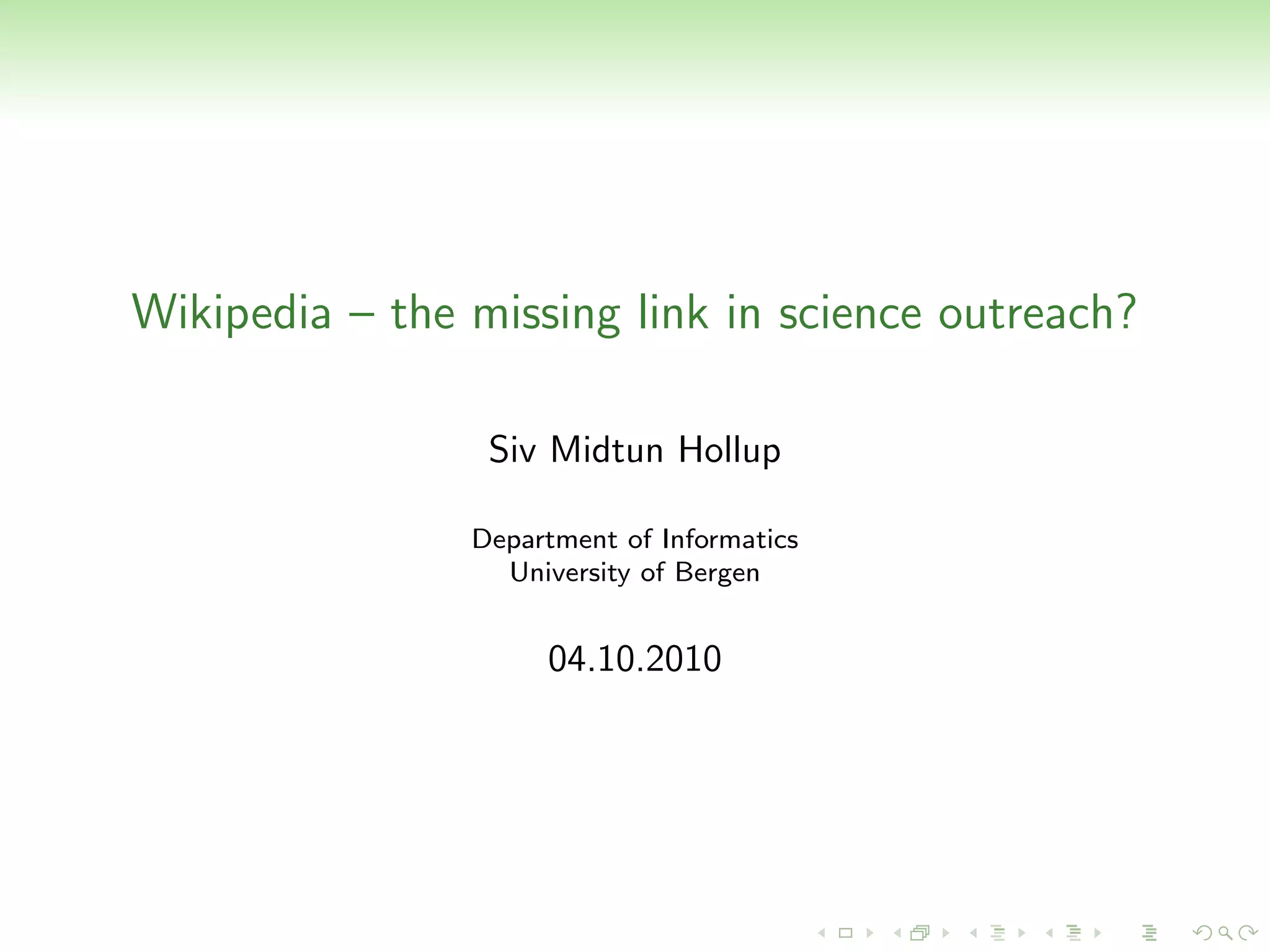 The document discusses using Wikipedia to improve science outreach and communication. It provides examples of how researchers can contribute to Wikipedia by writing overview articles on their fields of research, providing detailed explanations of concepts, and ensuring articles have updated references. The document outlines things for researchers to consider when contributing, such as audience and language. It also provides tips for writing for Wikipedia, including following syntax conventions and writing in a factual tone.