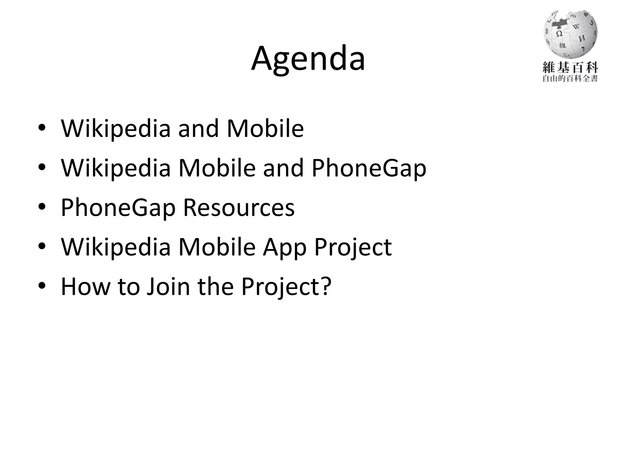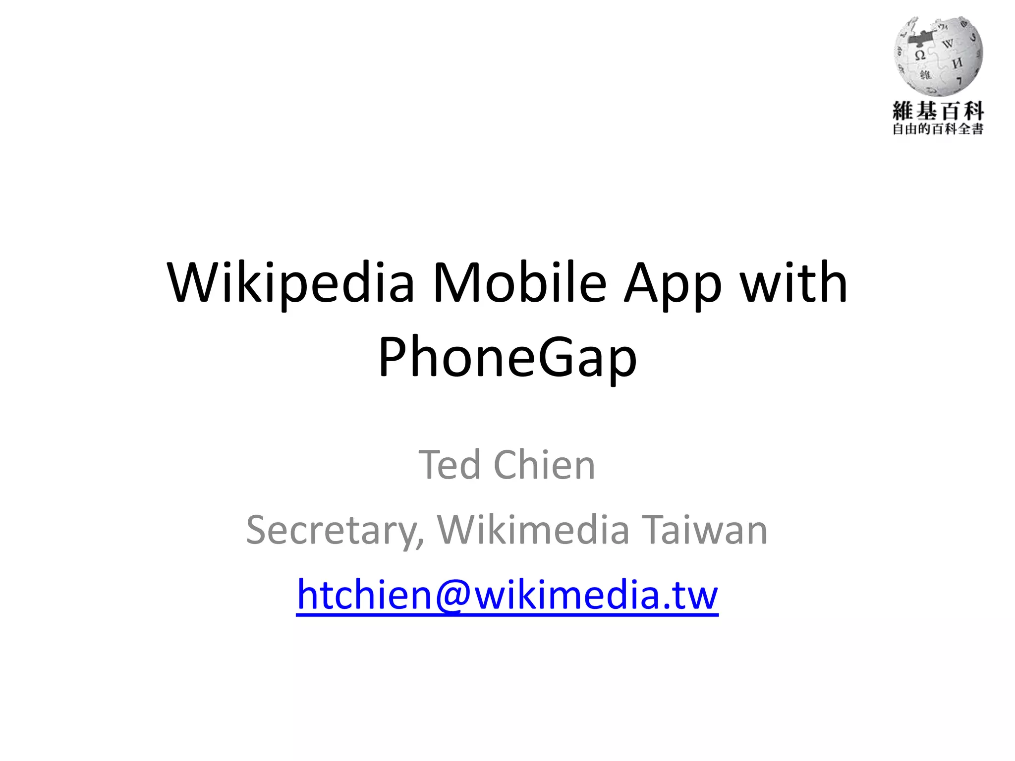 The document outlines the development and features of the Wikipedia mobile app, which utilizes PhoneGap to create a hybrid web application compatible with multiple mobile platforms. Key features include community translations, geo-location of articles, and an open code base, while the app aims for continuous improvement and broader platform support. Additionally, it provides resources for developers and instructions on how to participate in the project.