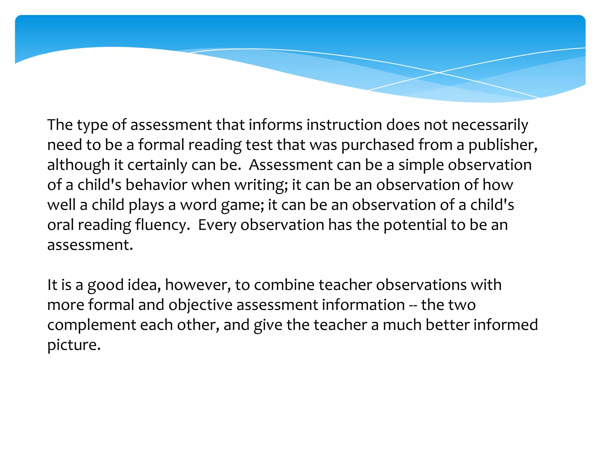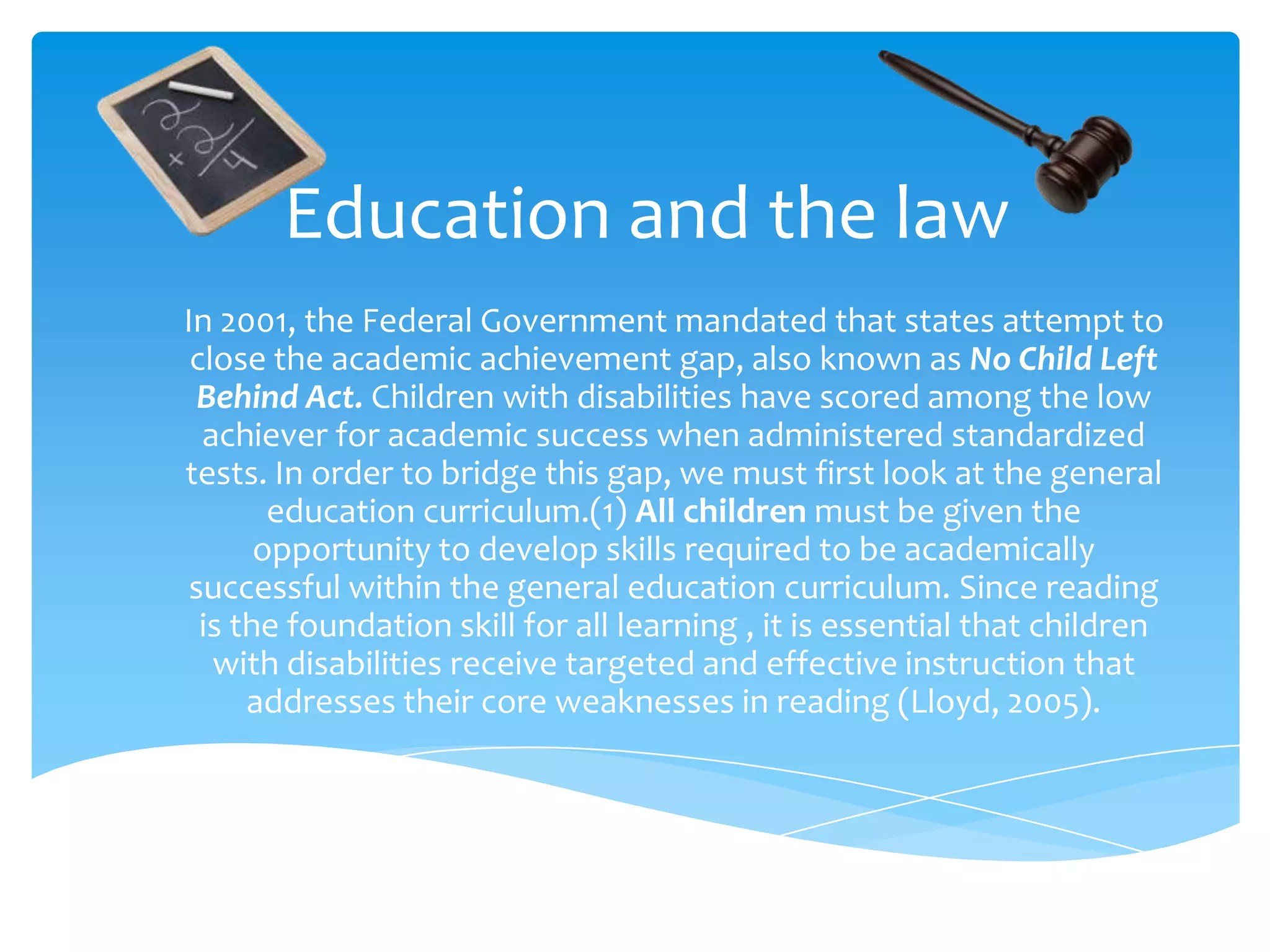 The document discusses education law and reading assessments. It notes that the No Child Left Behind Act mandated closing the achievement gap for all students, including those with disabilities. Effective reading instruction and targeted assessments are important to address core weaknesses, especially in foundational reading skills. Both formal and informal assessments provide teachers information to guide reading instruction. Long-term assessments allow ongoing monitoring of student progress and whole-student instruction, while short-term assessments provide periodic snapshots of reading levels to group students. Key components of an effective reading program include phonics, vocabulary, fluency, comprehension, and phonemic awareness.