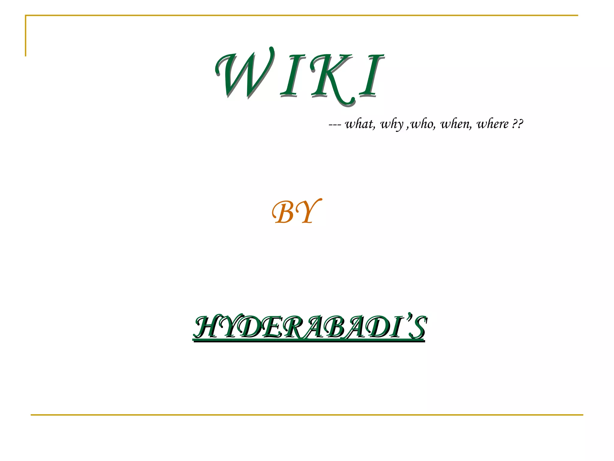 A wiki is a website that allows collaborative editing of its content and structure by its users. Wikis are easy to update and customize. The most well-known wiki is Wikipedia, which hosts over 10 million articles across 253 languages as of 2008. Wikis can be used by communities, organizations, schools, and businesses to collaboratively author and edit documents, manage projects, and share information in a central location. Common uses of wikis include establishing an internal company website or intranet, organizing meeting notes and documents, and managing calendars and agendas. Popular wiki platforms include WikiSpaces, MediaWiki, and PBWiki.