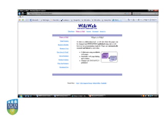 The document outlines the key characteristics and historical development of wikis, emphasizing their collaborative nature and various uses across education, business, and personal applications. It discusses challenges in user engagement, content management, and editing practices, using examples like Wikipedia and other failed wiki projects. Additionally, it explores the evolution of wiki software and different models, including open and closed wikis, while highlighting case studies that demonstrate their effectiveness in fostering community and knowledge creation.