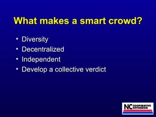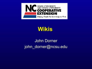 Wikis are collaborative websites that allow anyone to easily add, edit, or remove content. They work well because they are fast, open, transparent, and scale to large communities as more people contribute. However, wikis may not work well in organizations with a lack of open culture or control, or among small communities uncomfortable with new technologies. The "wiki way" is to freely fix anything that needs fixing through consensus-based collaboration and respect for diverse ideas. Wikis can be useful both internally for team projects and documentation, and externally for public information sharing.