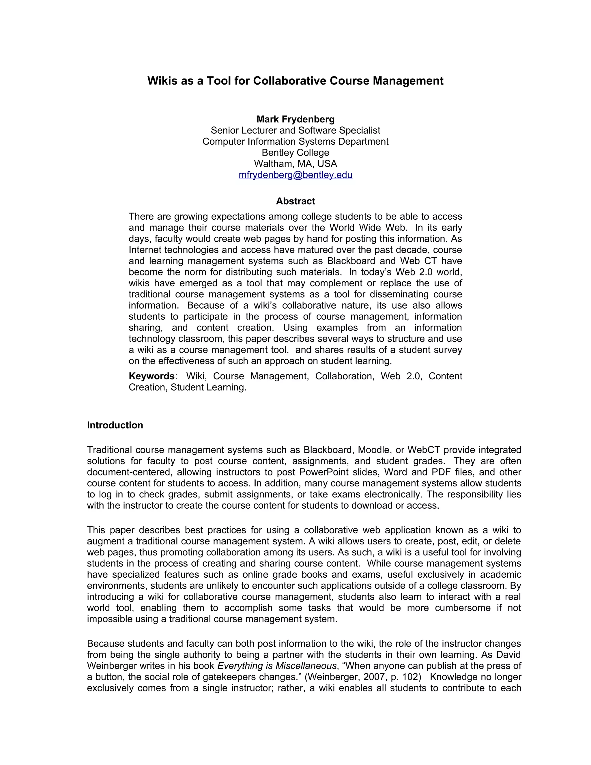 This document discusses using wikis as a tool for collaborative course management. It begins by describing how traditional course management systems are often document-centered and instructor-controlled, while wikis allow for more collaboration between students and instructors. It then provides details on how wikis work and their increasing educational uses for tasks like group projects, note-sharing, and course reviews. Potential educational concerns with wikis like security and lack of structure are addressed. The document concludes by describing how a wiki was used in an introductory technology course for syllabus management, project management, collaborative writing and studying.