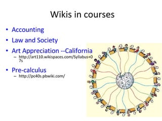 The document discusses the role of wikis in education, emphasizing their collaborative and active learning advantages over traditional teaching methods. It outlines various contributors and roles within a wiki environment, such as maintainers and wiki gnomes, and stresses the importance of community engagement and respectful debate. Additionally, it provides best practices for effective wiki use, including editing, establishing etiquette, and fostering participation.
