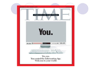 The document discusses the history and evolution of the World Wide Web and user-generated content. It describes the overhyped rise of the dot-com era in the 1990s, the crash in 2001, and the emergence of more stable Web 2.0 technologies post-2002 that enabled user participation through blogs, wikis, and social media. It outlines how content creation shifted from traditional media to the masses through various self-publishing tools and user-generated content on sites like Wikipedia, YouTube, and social networks.