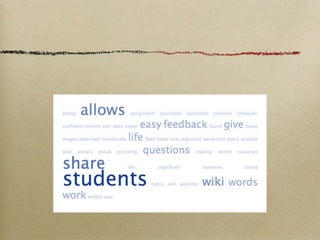 This document discusses using wikis in education. It begins by asking how familiar the reader is with wikis and then defines a wiki as a website that allows easy collaboration. It explains that wikis allow users to easily post documents, comment on student work, display information for students and parents, explain homework, and more. The document then discusses how NIS has implemented wikis for students to collaborate, display work, get peer and teacher feedback, and access resources. It provides examples of NIS wiki pages and encourages readers to set up their own wiki to facilitate communication and sharing for educational purposes.