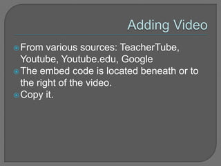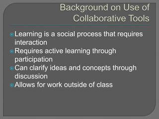 Wikispaces allows teachers to create private, classroom wikis for students to collaborate online. Wikis can be used to share resources, have lesson discussions, collaborate on assignments, and disseminate information beyond the classroom. Teachers can control permissions, invite students, manage pages and content, and add features like documents, videos, forms and more. Wikis provide interactive, online spaces for students to engage in classwork outside of class time in a safe, organized environment.