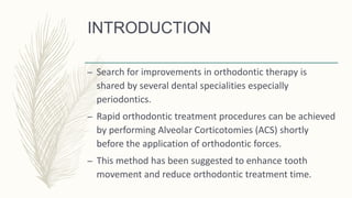 Wilckodontics, presented by Dr. Shraddha Kode, is an advanced orthodontic treatment method that utilizes alveolar corticotomies to enhance tooth movement and reduce treatment time. It combines orthodontic techniques with periodontal surgery, resulting in faster tooth movement, increased post-treatment stability, and is effective for various malocclusions; however, it carries surgical risks and higher costs. The technique has evolved through contributions from various orthodontic pioneers and advocates interdisciplinary collaboration for improved patient outcomes.