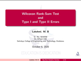 The document discusses the Wilcoxon Rank-Sum test, a non-parametric hypothesis test that checks if two populations are identically distributed. It assumes the two populations are identically distributed and their ordering would be evenly intermixed. The test ranks all observations from both groups as if they come from one large group, then sums the ranks for at least one population's sample. It also discusses Type I and Type II errors in hypothesis testing, where a Type I error rejects the null hypothesis when it is true, and a Type II error accepts the null hypothesis when it is false. The probabilities of each are denoted by alpha and beta, respectively.